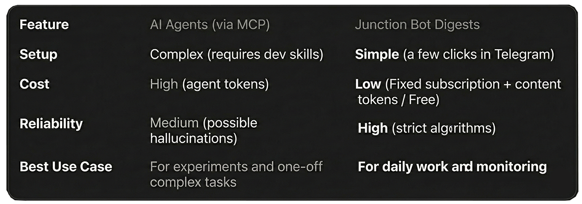Let’s break down the fundamental difference between these approaches and explain why you most likely don’t need an all-powerful AI agent to generate digests.