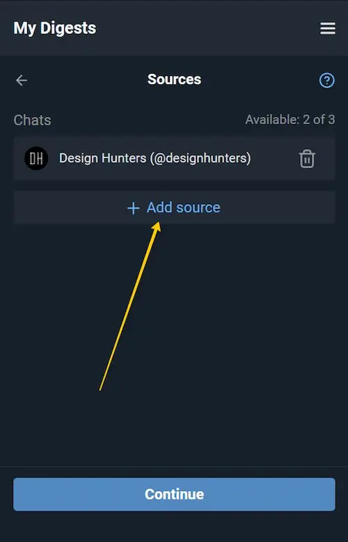 You can include additional channels or groups in the digest by clicking «Add source». In the free mode, up to 3 sources are available; this limit can be increased by upgrading to a paid bundle (see Pricing).
