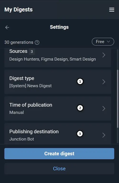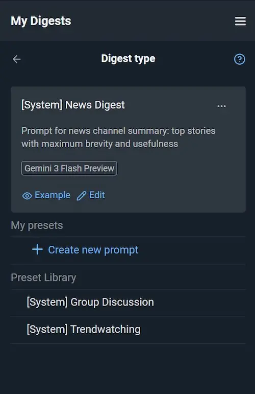 (1) Digest type determines how the AI formats and presents the information. You can keep the default preset (e. g., News Digest or Group Discussion) or create your own format. Click «Edit» to modify an existing template or «Create new prompt» to adjust the instruction text, AI model, or other settings (see detailed docs: Digest type).