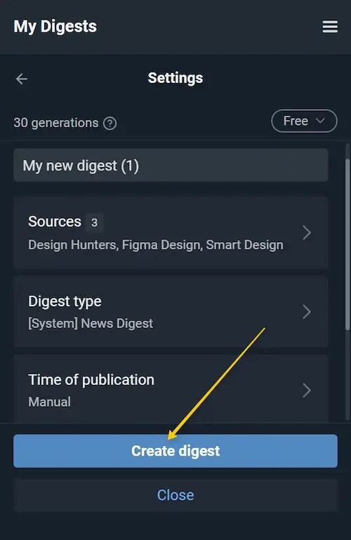 Done! Your digest is ready! The name and all other settings are set by default. Click «Create digest» to save it. Additional options are described below.