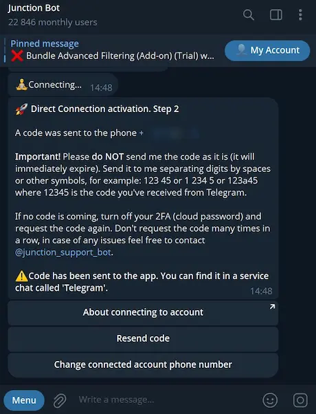 Next, the bot will ask you to enter the code sent from Telegram to the new number. This is necessary to connect the account to the bot.