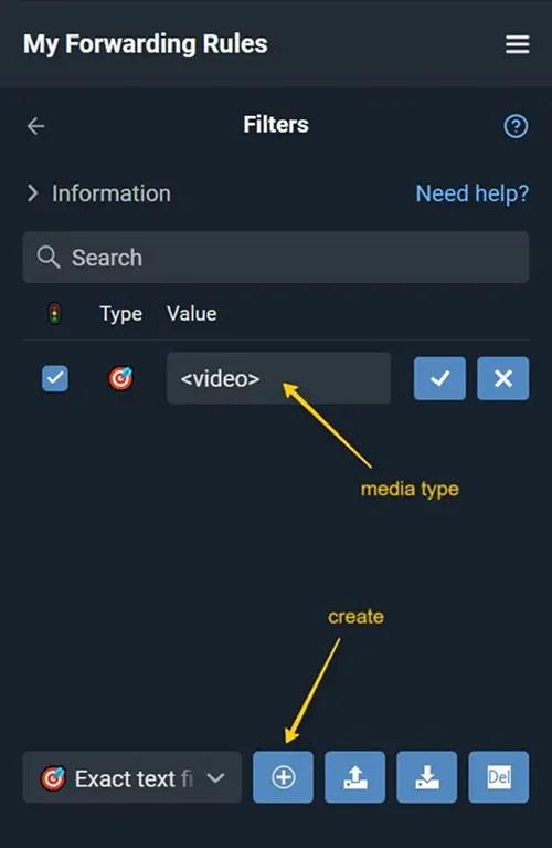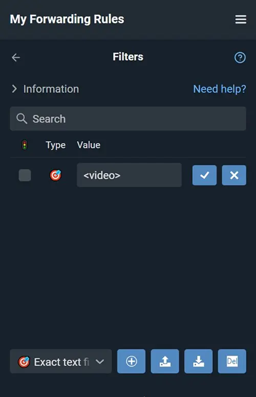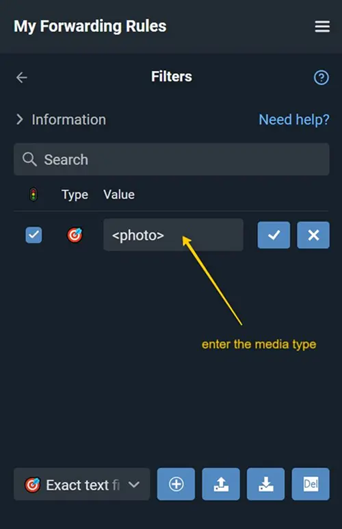 Done! Now only messages containing the selected media type (e.g. images) will be forwarded - with or without text. All other media types and text messages will be ignored.