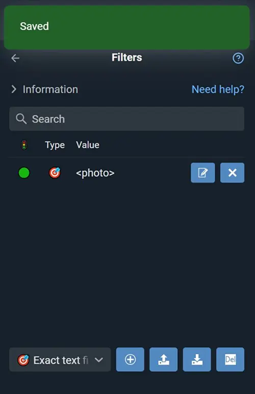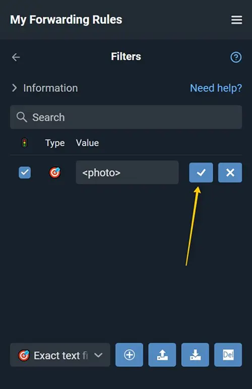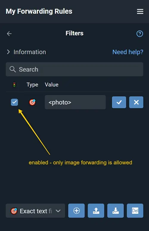 If the checkbox is enabled, an allowing filter will be created for messages with images. For example, no other messages will be sent to your channel, except for messages with photos.
