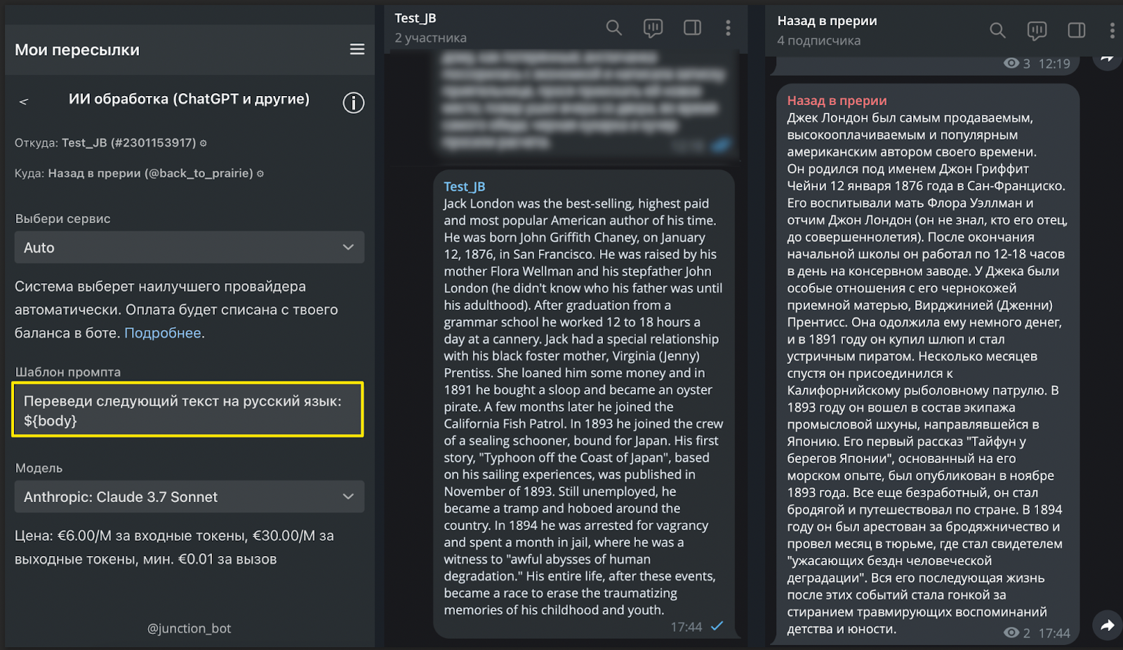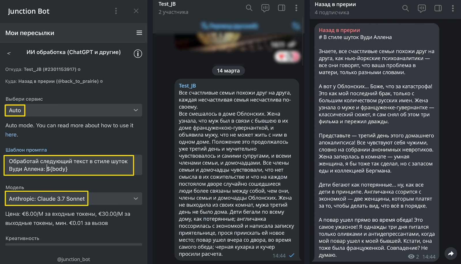 Ведение каналов требует времени, особенно если вы работаете с контентом из разных источников. Но рутину можно автоматизировать. В этой статье мы рассмотрим примеры, как с помощью Junction Bot и нейросетей стилизовать (рерайтить), обрабатывать и переводить текст, а затем автоматически публиковать его в своих Telegram-каналах.